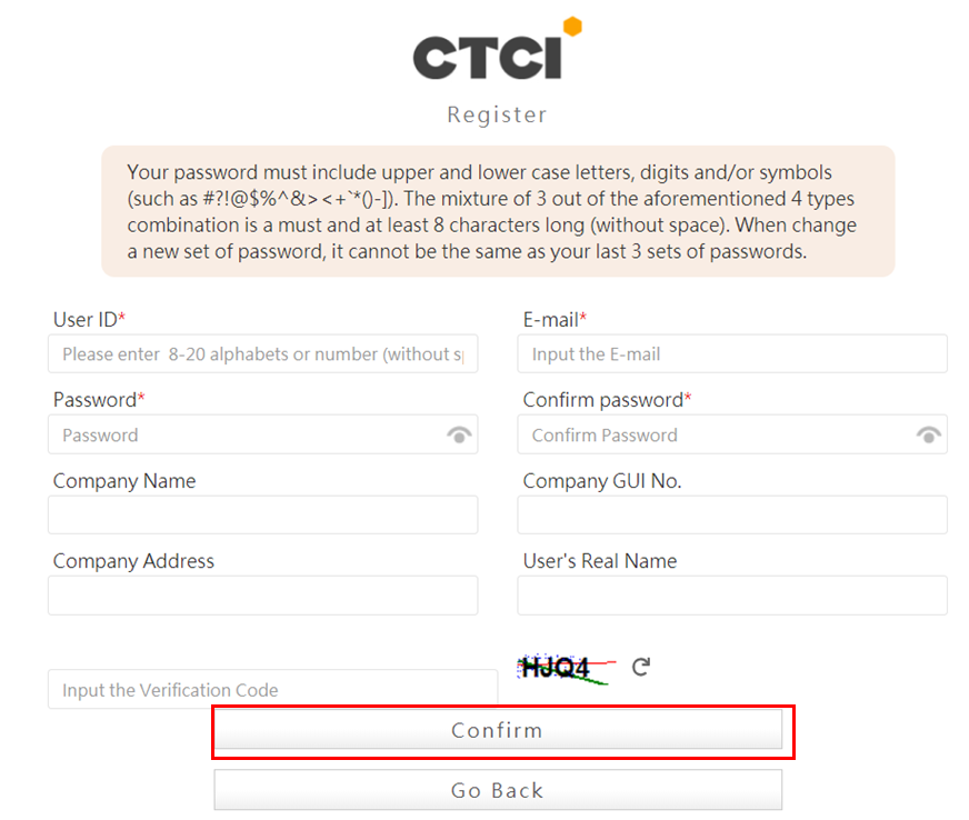 Step3. After you fill out all the required information for registration, click “Confirm” to submit ( columns with “ * ” sign means essistienal item, cannot be blank)