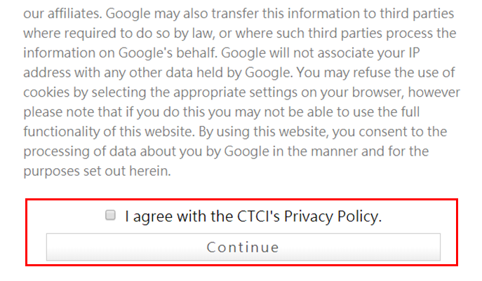 Step2. If you agree with CTCI’s Privacy Terms, tick the check box then, click “Continue”