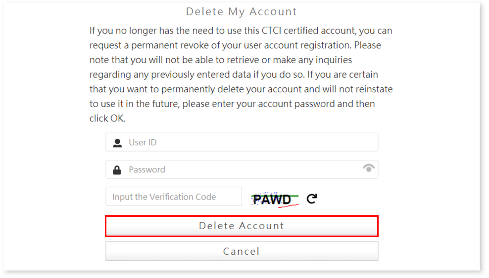 Step1. If you no longer has the need to use this CTCI certified account, you can revoke your user account forever. In the page like the picture below, fill in your user account id. After the information is completed, click “Delete Account” to confirm.