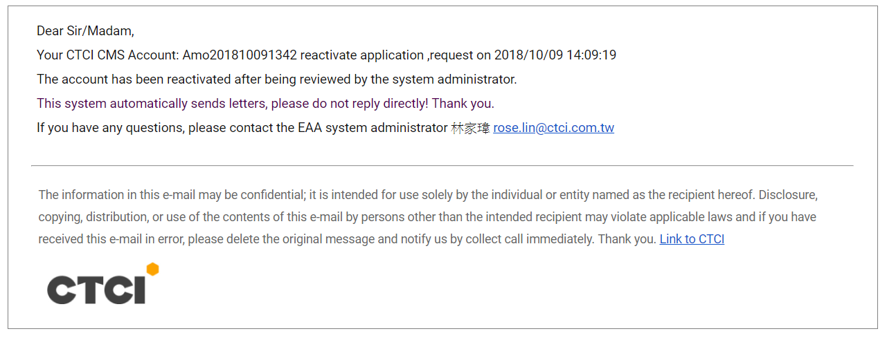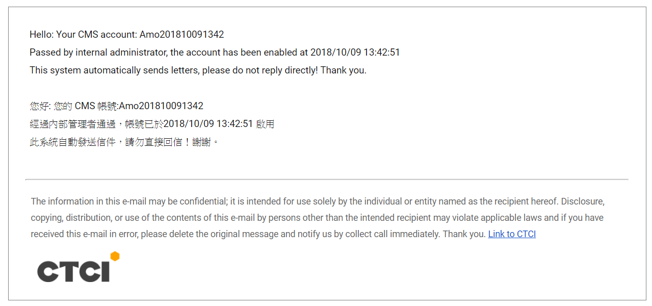 Step4. After the System Administrator approved the application, User will receive an email like the picture below. That means the registration is successfully done.