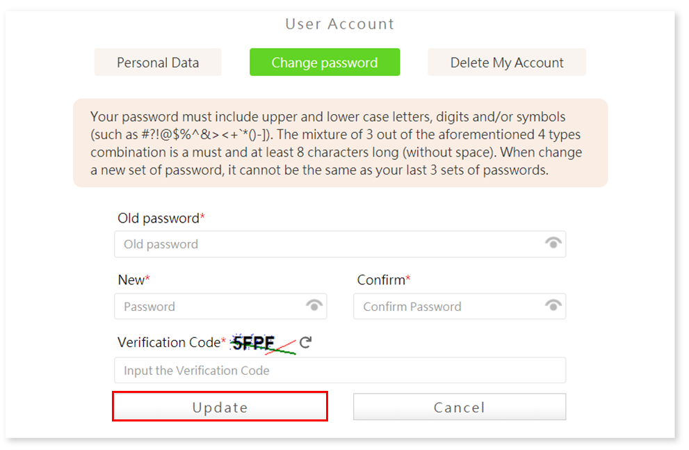Step1. At the Change Password page, filled out the old password and new password (Twice), and type in the random verification code, then, click “Update” to submit your new password.